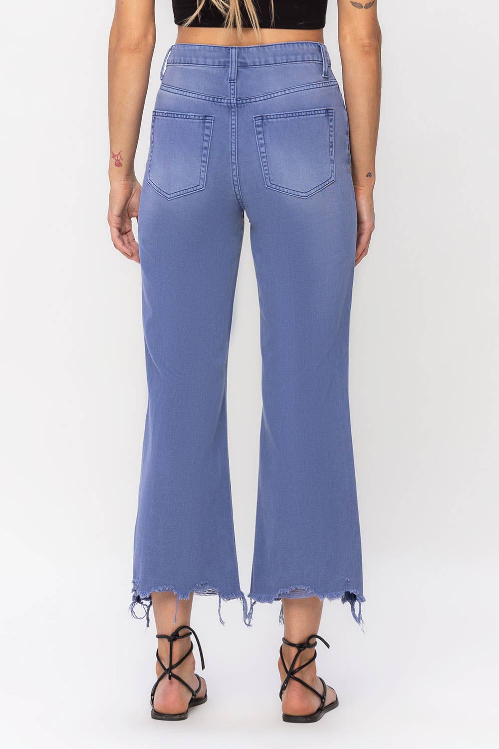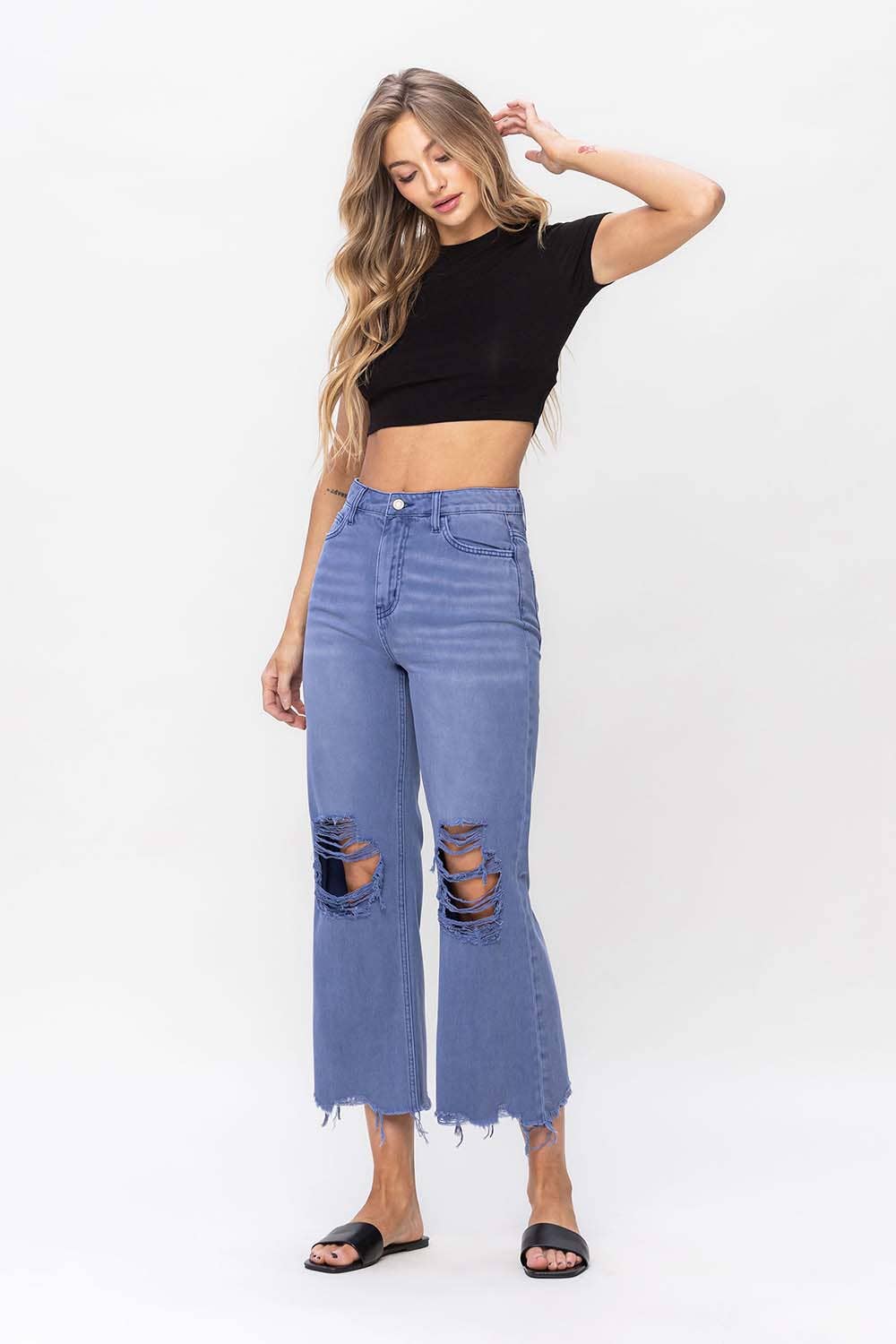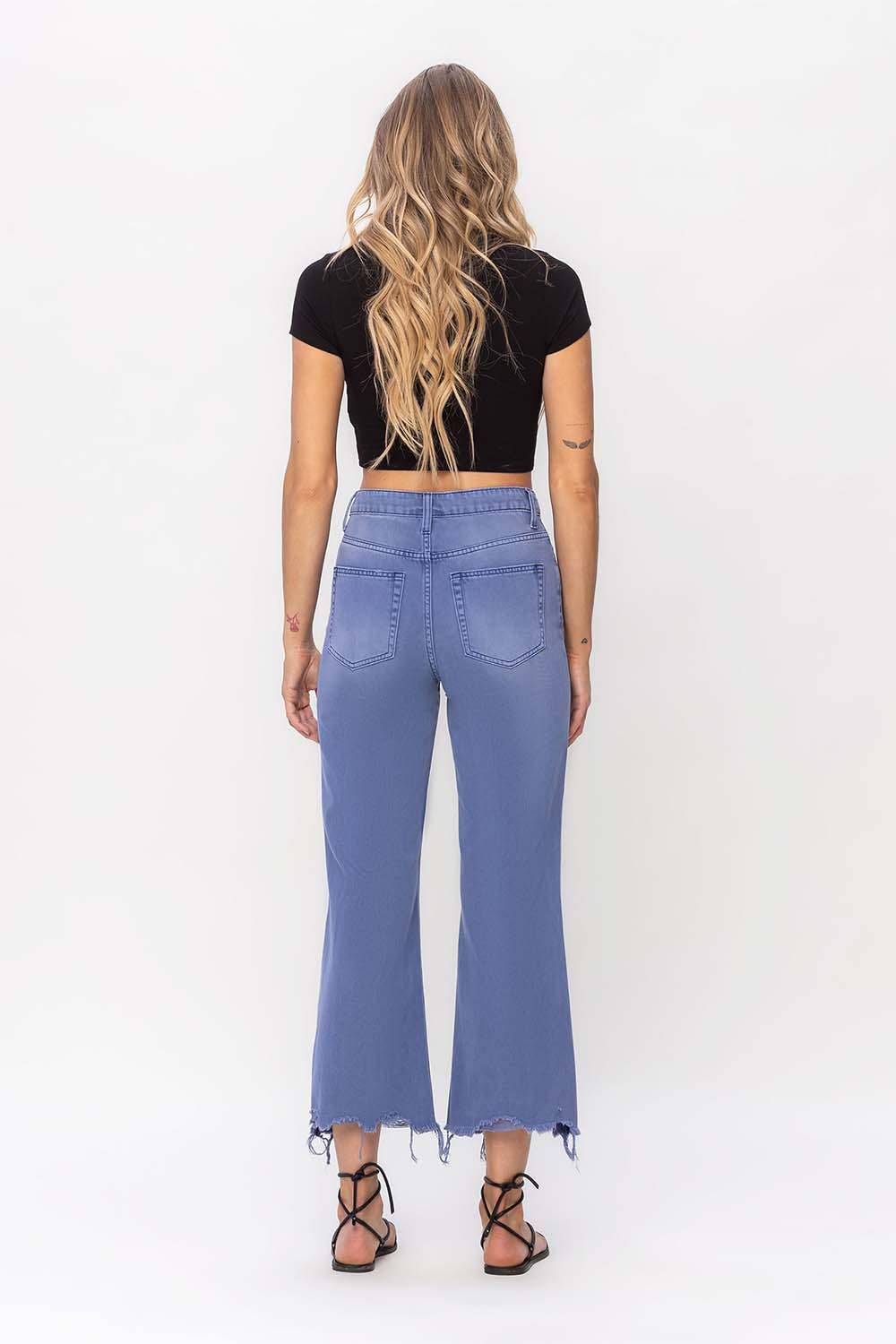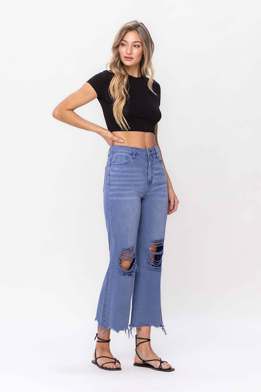 90'S VINTAGE SUPER HIGH RISE CROP FLARE JEANS NON STRETCH DENIM, 90'S VINTAGE STYLE, SUPER HIGH RISE WAIST, DISTRESSED DETAIL, RAW HEM, CROPPED LENGTH, FLARE JEANS F. R