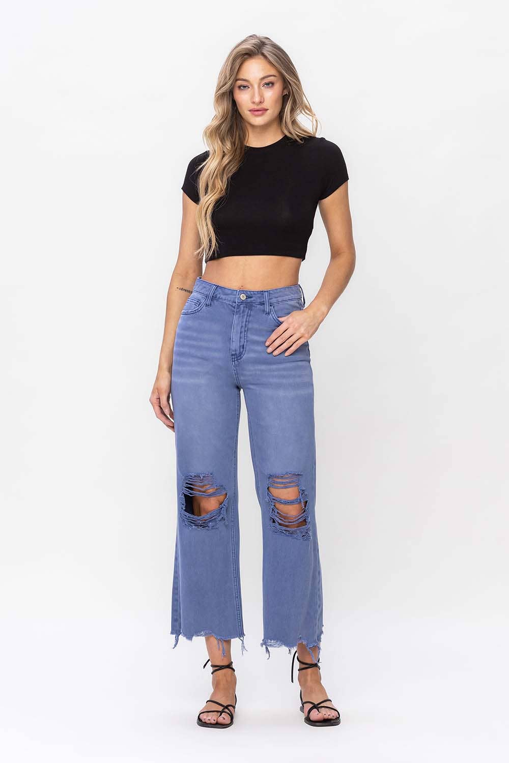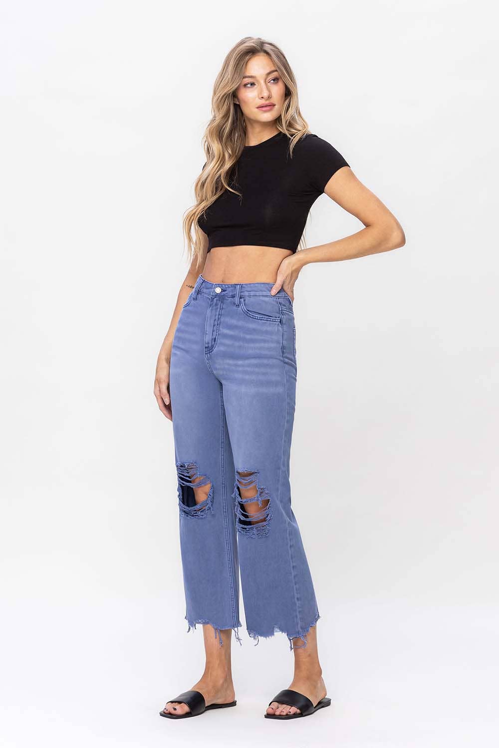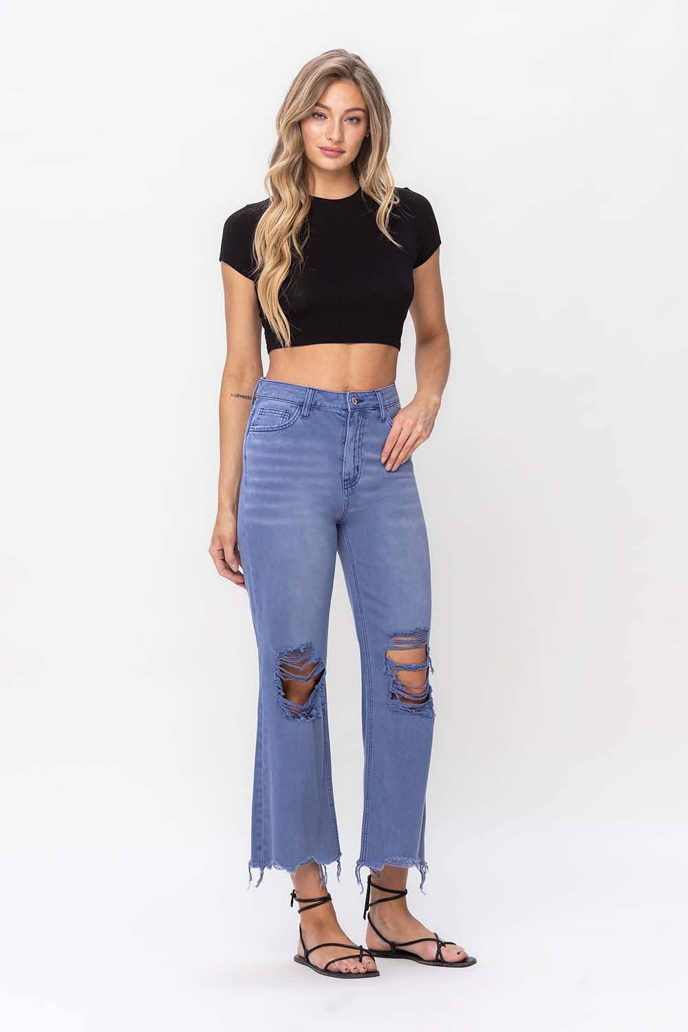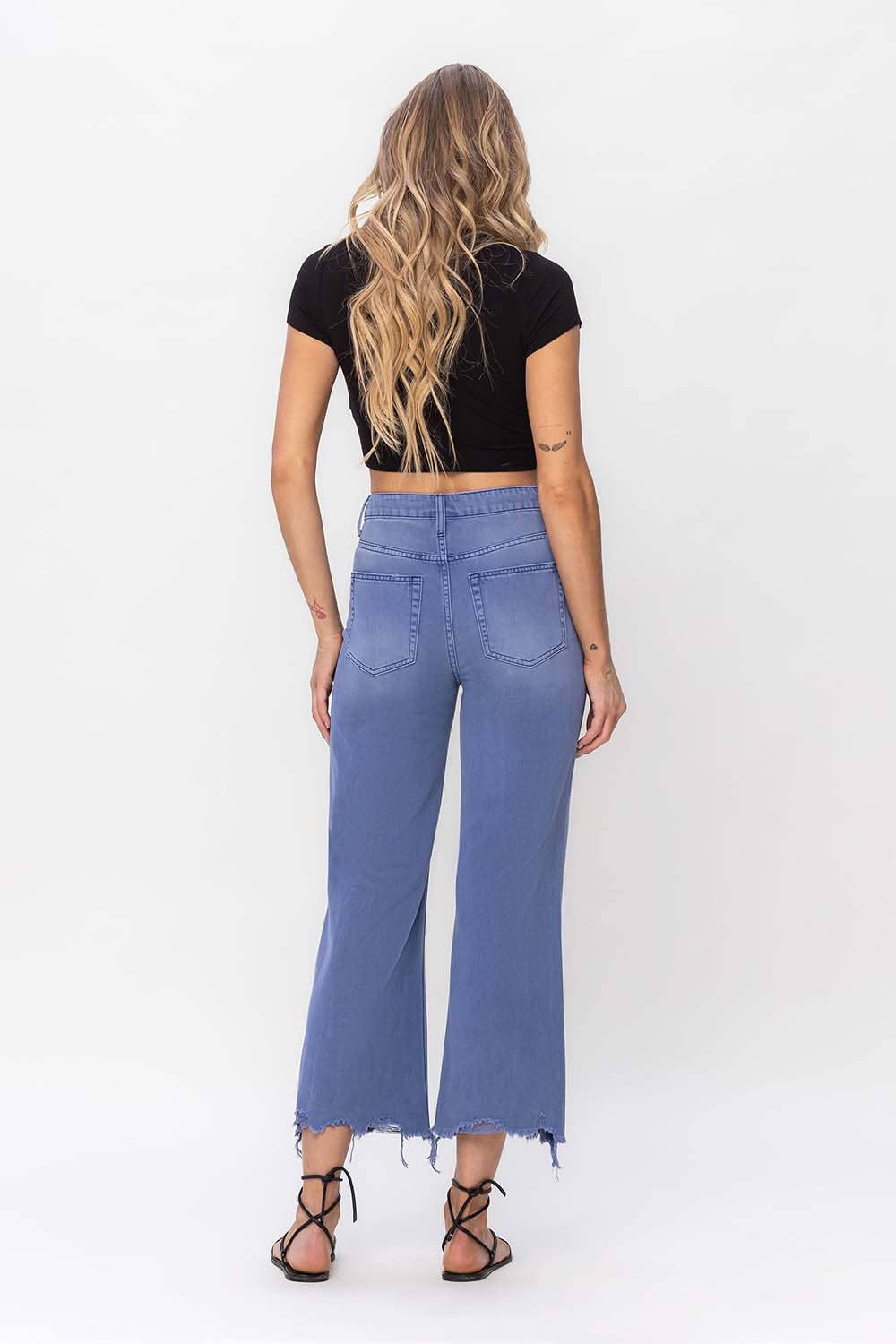 90'S VINTAGE SUPER HIGH RISE CROP FLARE JEANS NON STRETCH DENIM, 90'S VINTAGE STYLE, SUPER HIGH RISE WAIST, DISTRESSED DETAIL, RAW HEM, CROPPED LENGTH, FLARE JEANS F. R