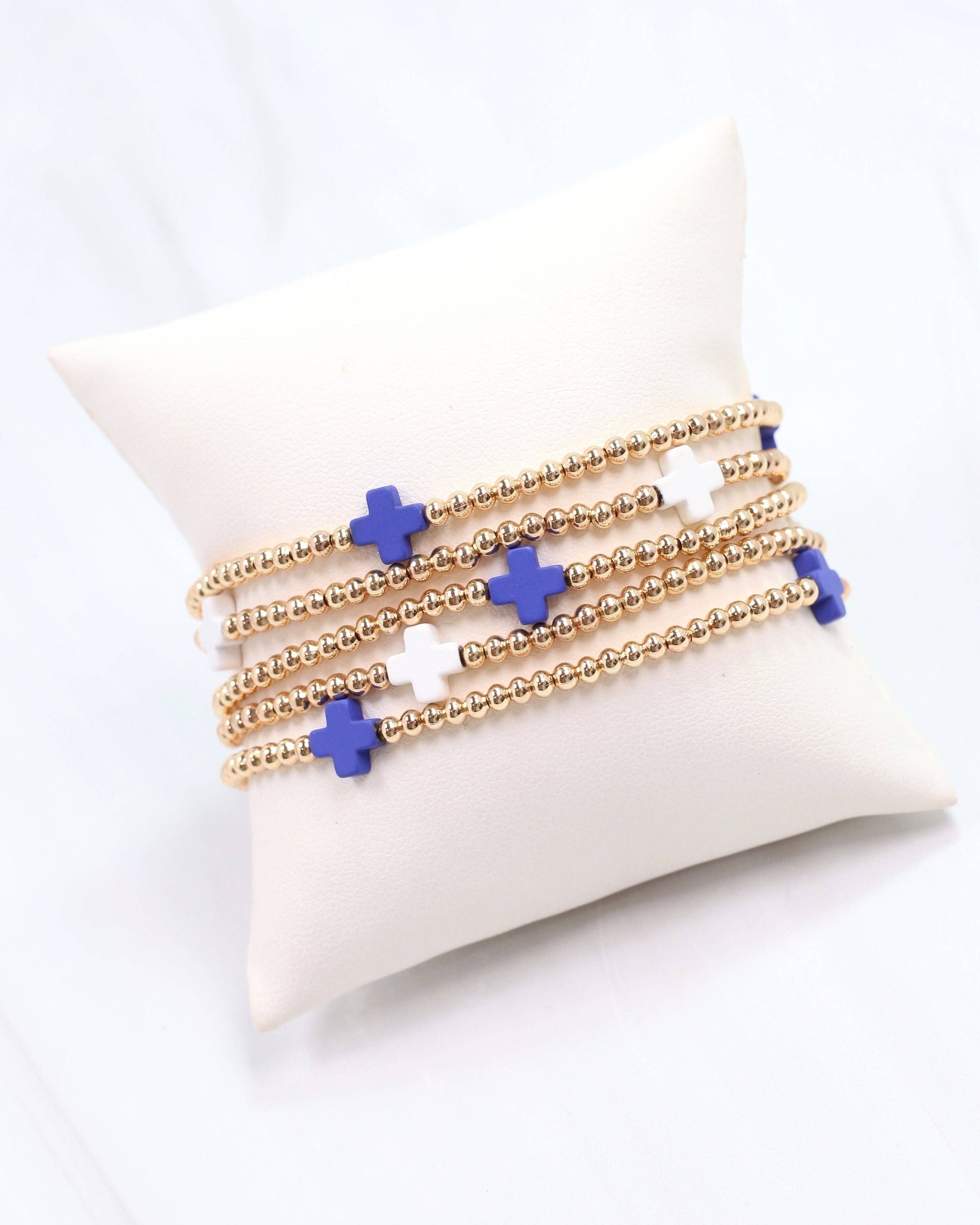 Show off your school spirit with the Brittany Cross Bracelet Set in Blue and White! These stretchy gold beaded stacking bracelets feature vibrant solid-colored crosses, adding a fun and stylish touch to any outfit. Perfect for layering or wearing solo, they’re the ideal way to celebrate your pride with a playful flair.