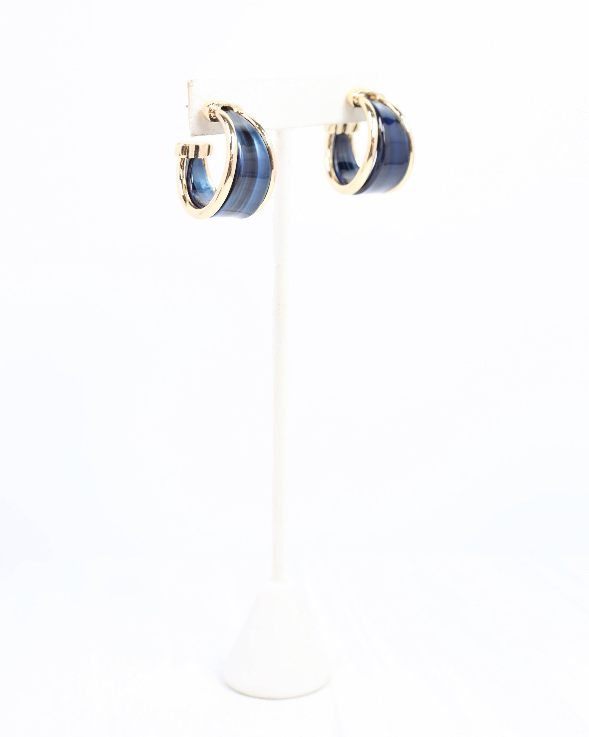 Add a splash of autumn charm to your look with these Daphne Gold Trimmed Hoop Earrings. Lightweight and effortlessly stylish, their warm navy acetate and shiny gold accents blend with any outfit, making them your go-to for cozy fall vibes. Easy to wear, impossible to ignore!