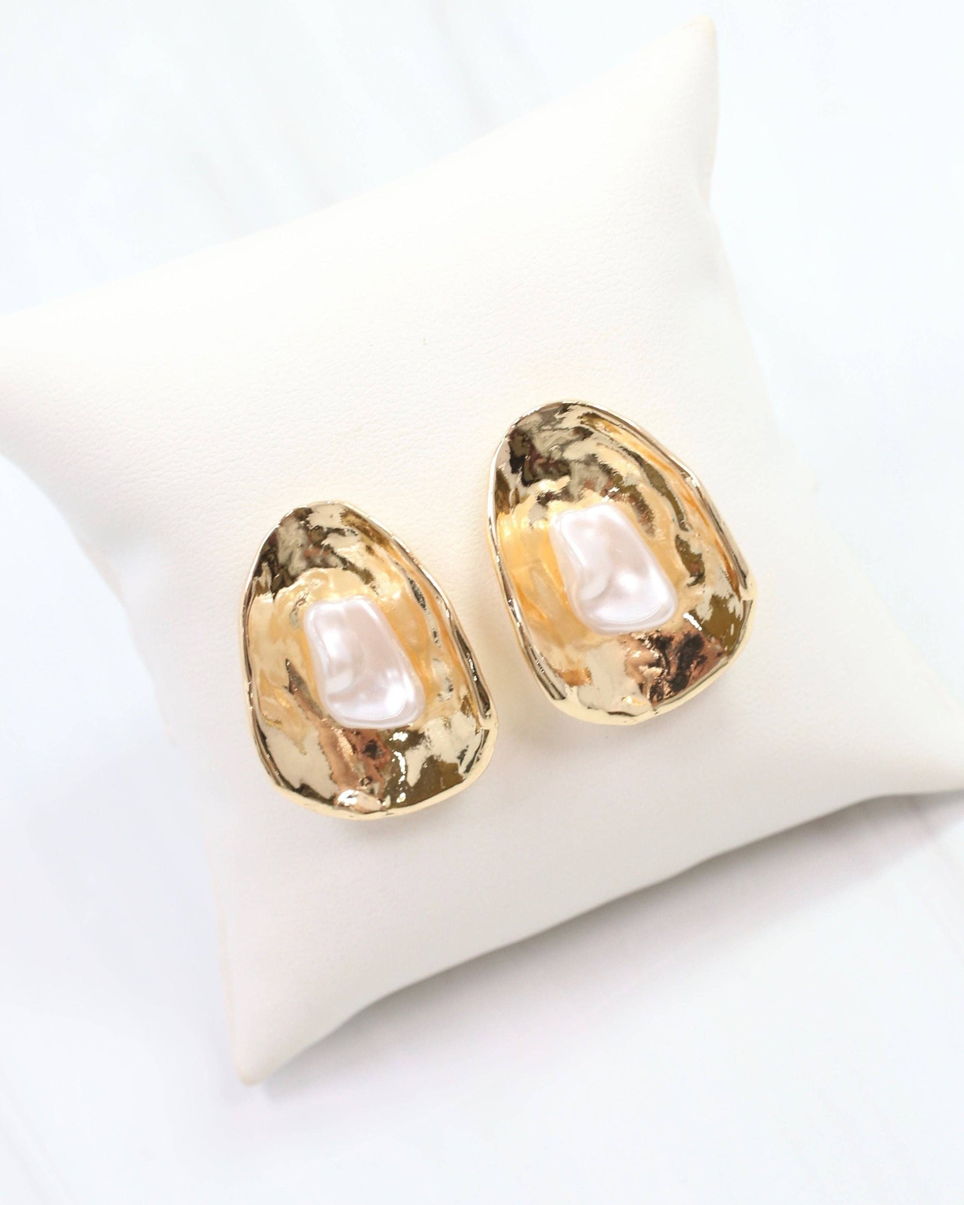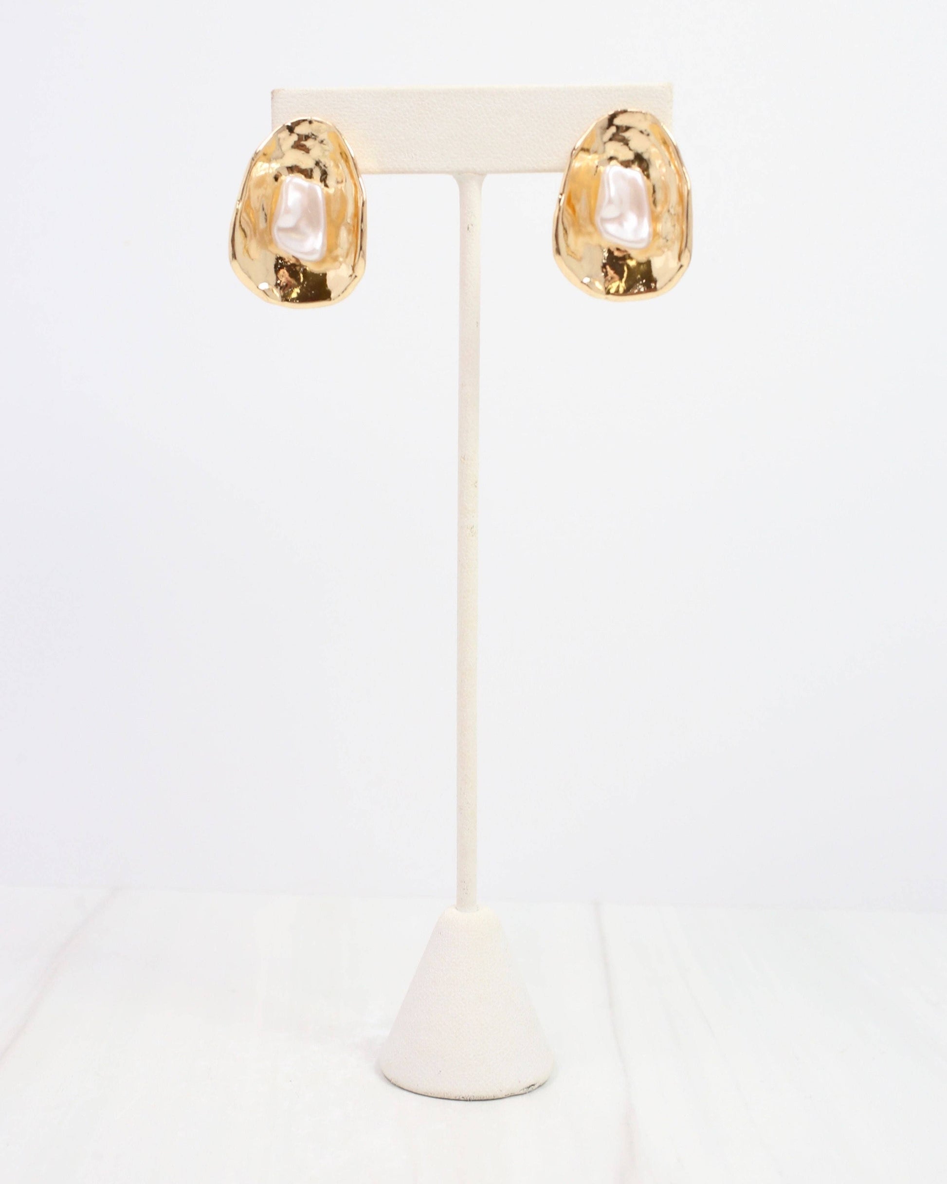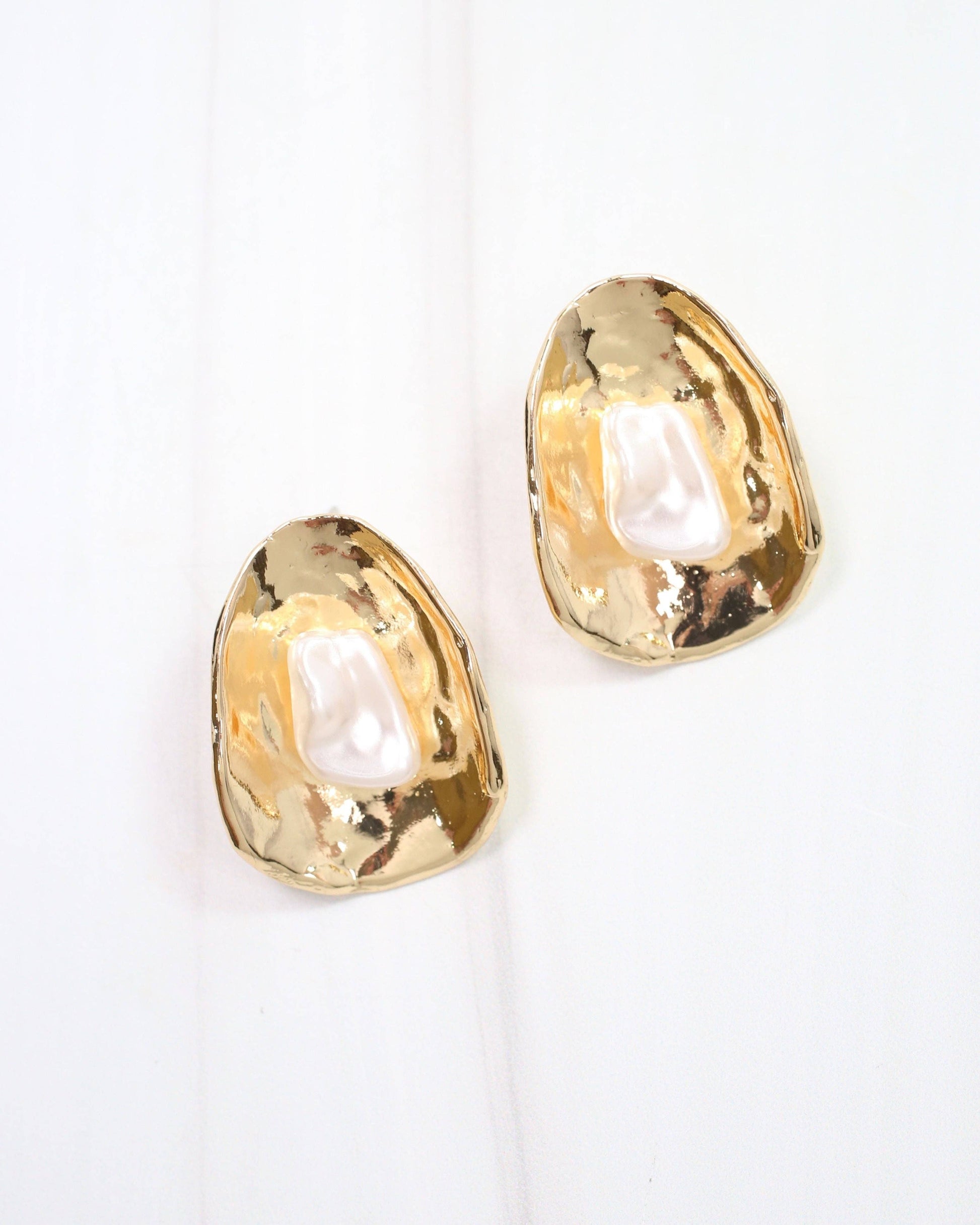 Elevate your style with our Dauphine Gold and Pearl Post Earrings. These lightweight statement pieces feature a stunning hammered gold stud design with an exquisite baroque pearl center. The perfect blend of eclectic artistry and timeless elegance, these earrings add a touch of sophistication to any outfit.