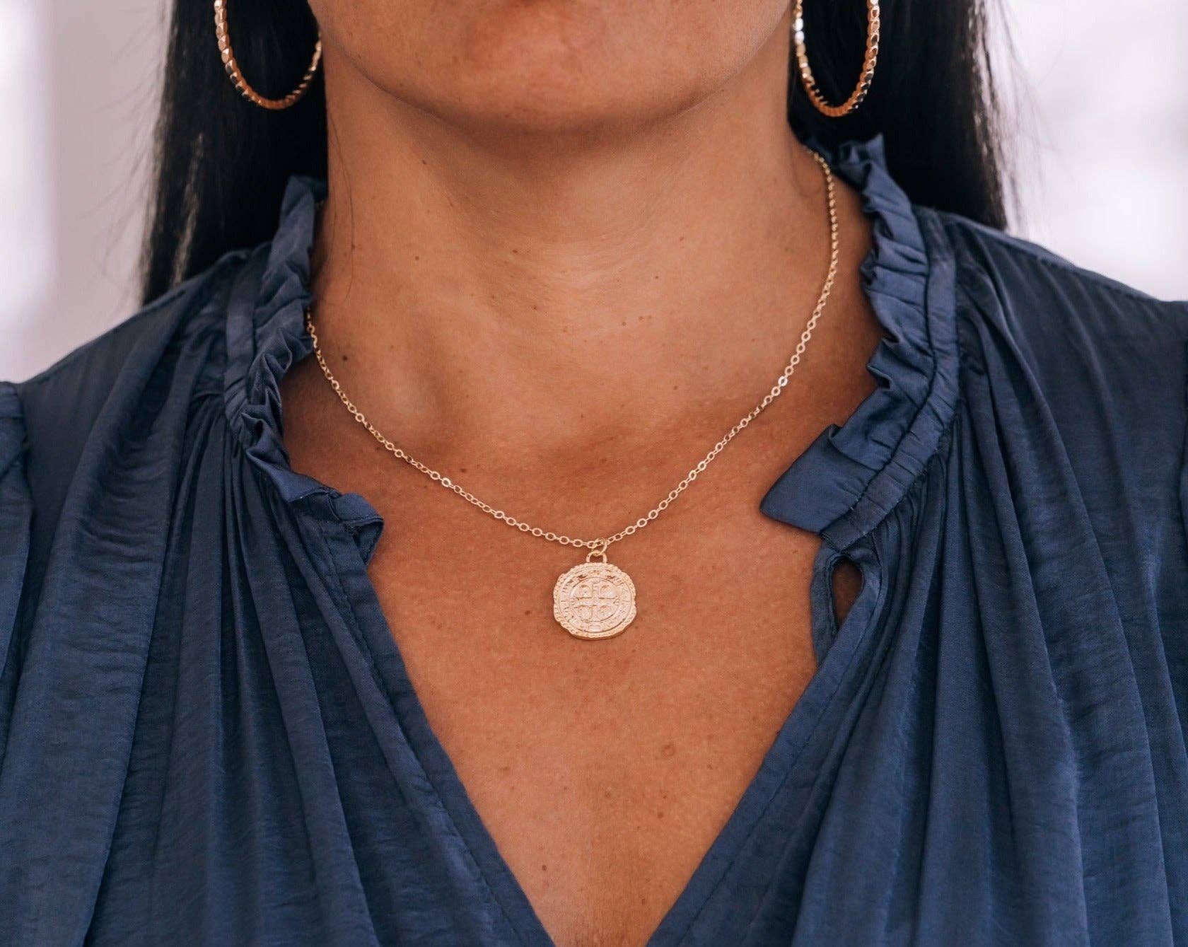 This beautiful 18" 16k gold-filled necklace comes in 3 choices for you to choose from. Each choice full of meaning and something you will wear for years to come. A rustic cross coin medallion, a Cubic Zirconia cross, or a Mother-of-Pearl Mary charm. We love each one the same and made this necklace in our timeless collection to be layered with any other piece or to wear on it's own.