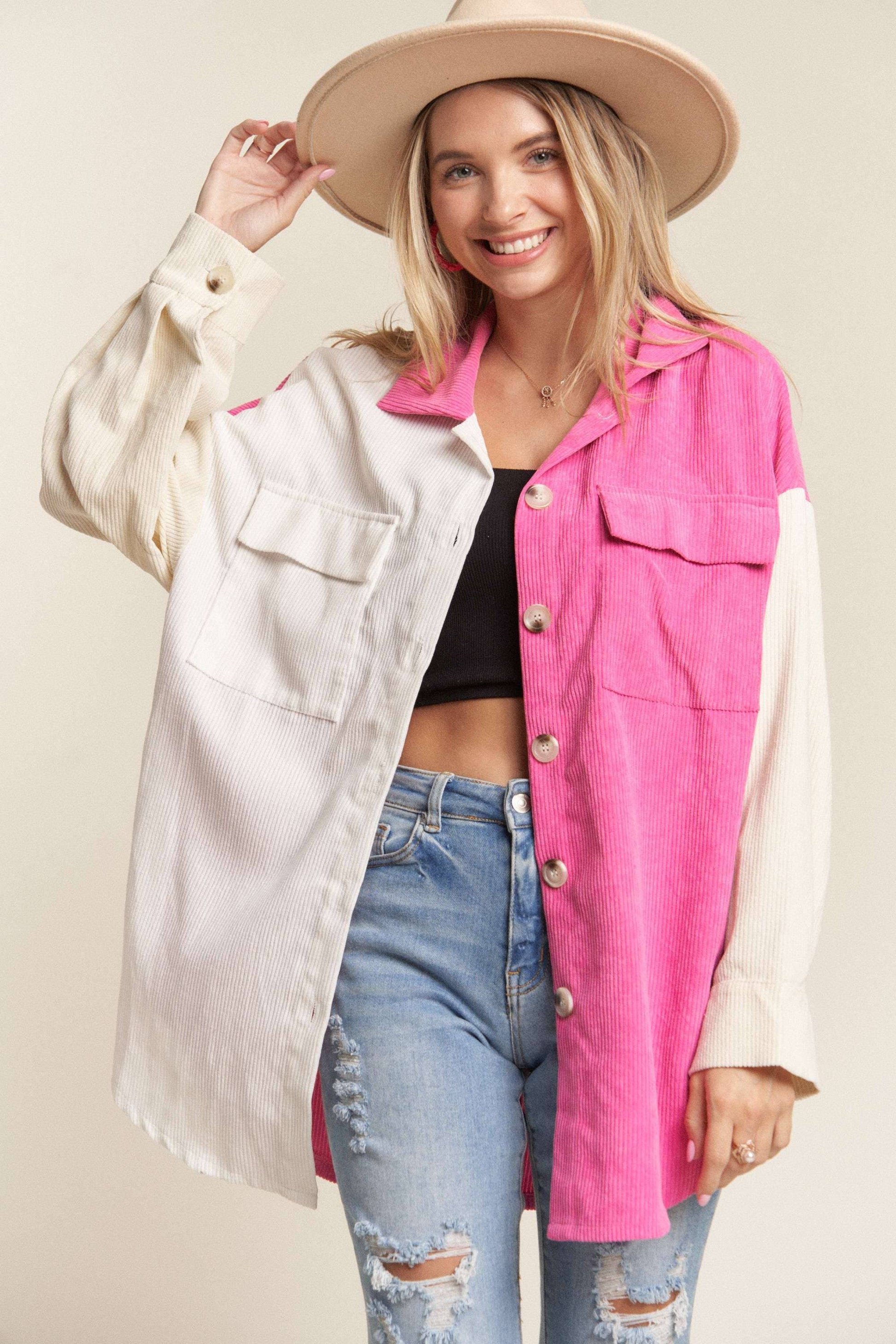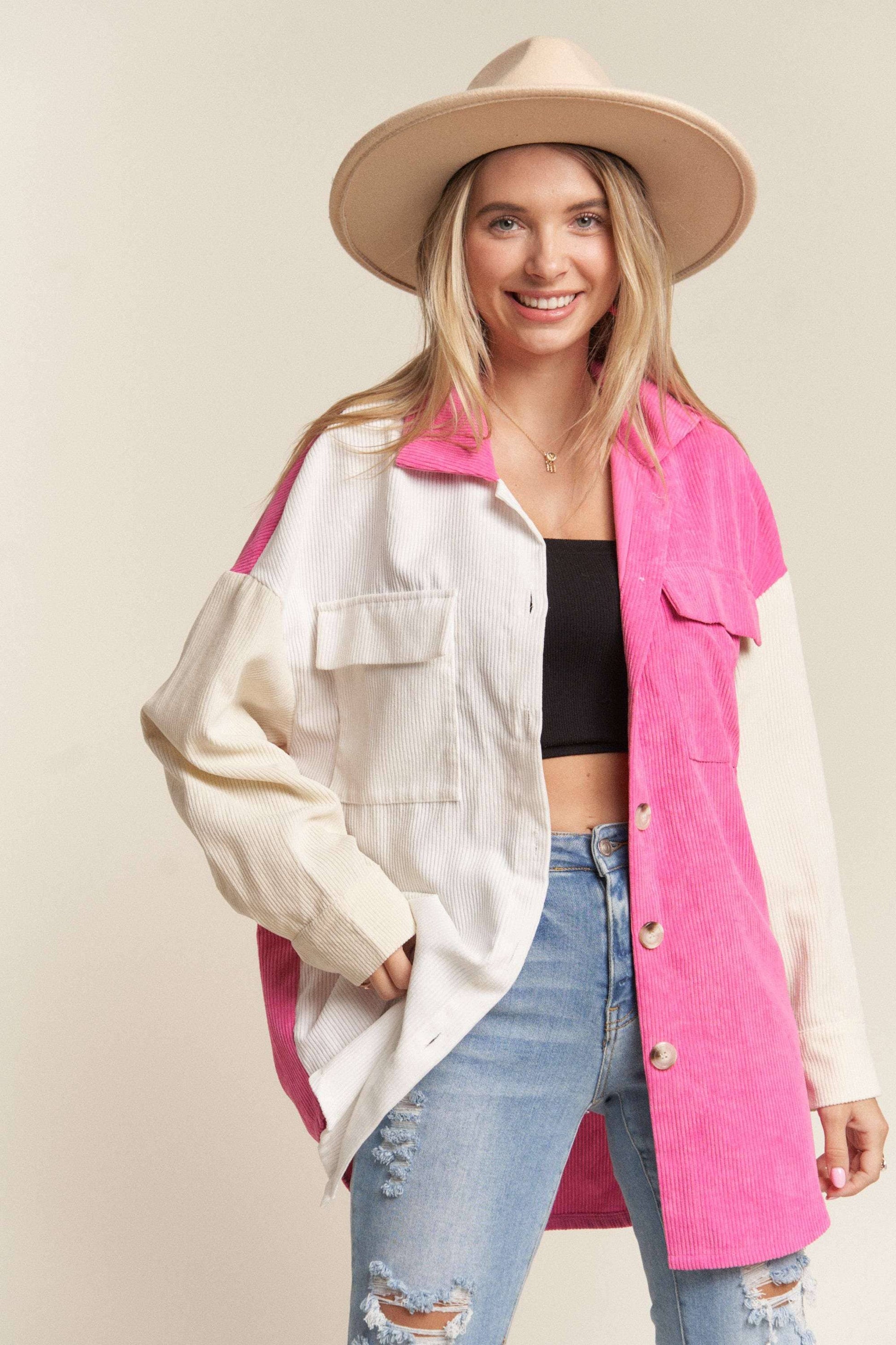 LEJ2636- CORDUROY COLOR BLOCKED SHACKET: WHITE/HOT PINK