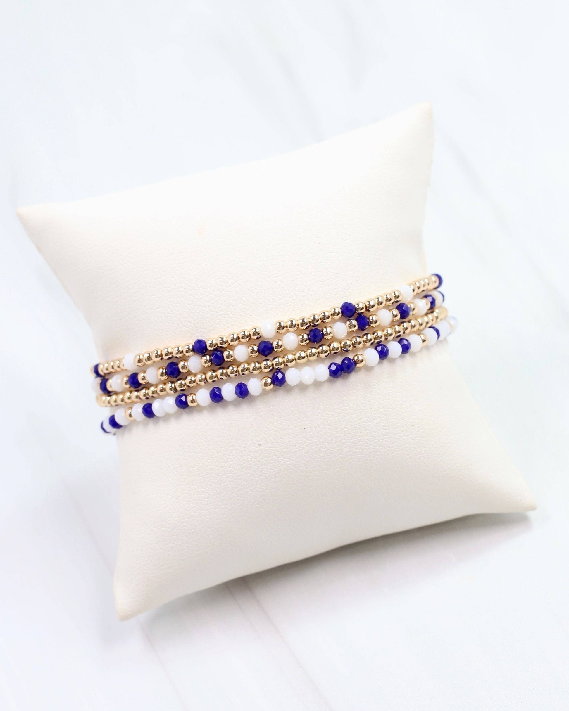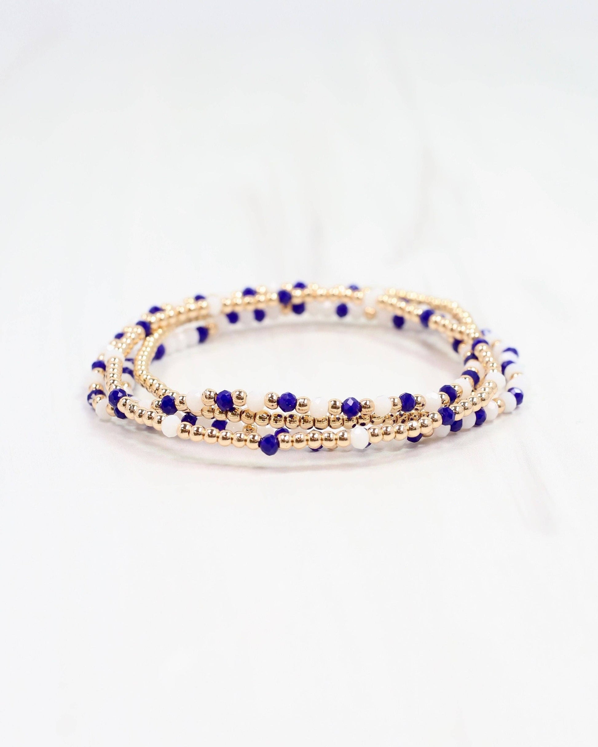 Add a pop of sparkle and team spirit with the Lottie Beaded Bracelet set in Blue and White! Featuring four stretchy strands adorned with gold and colorful glass beads, these bracelets are perfect for stacking and mixing with your favorite accessories. Comfortable and flexible, they fit most wrists with ease.