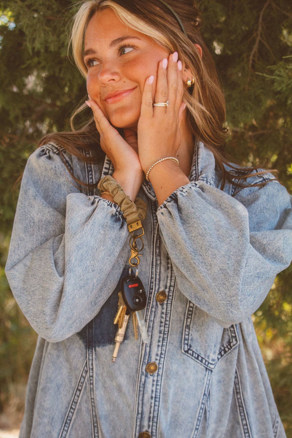 Andi keychains are the cutest you'll find! This keychain is the perfect textured corduroy fabric in the cutest olive green color. Absolute perfection for fall! Get this to hold all your necessities and keep your pockets and hands free while adding a cute and stylish flair.