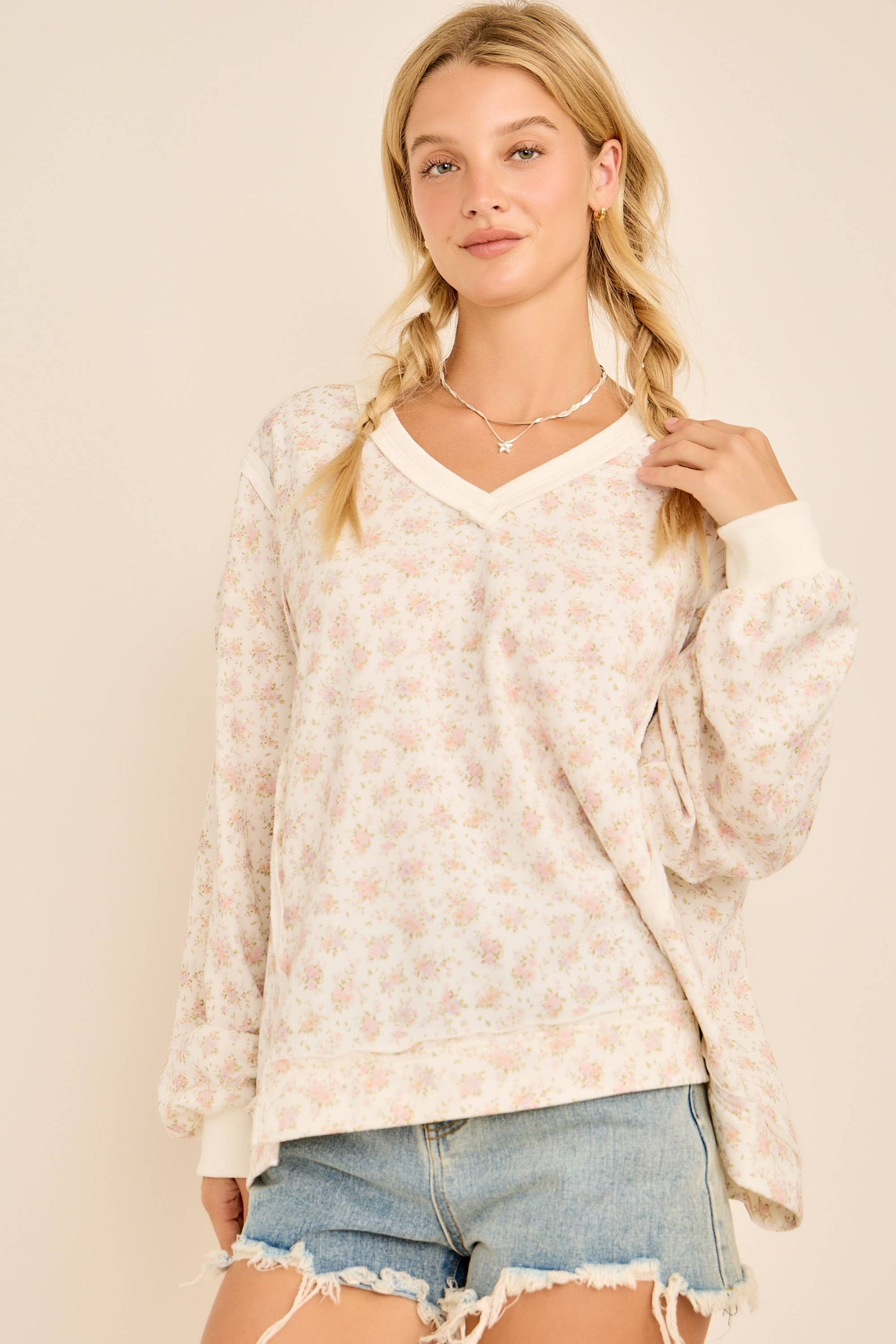 Oversized Floral Print V-Neck Long Sleeve Sweatshirt: IVORY