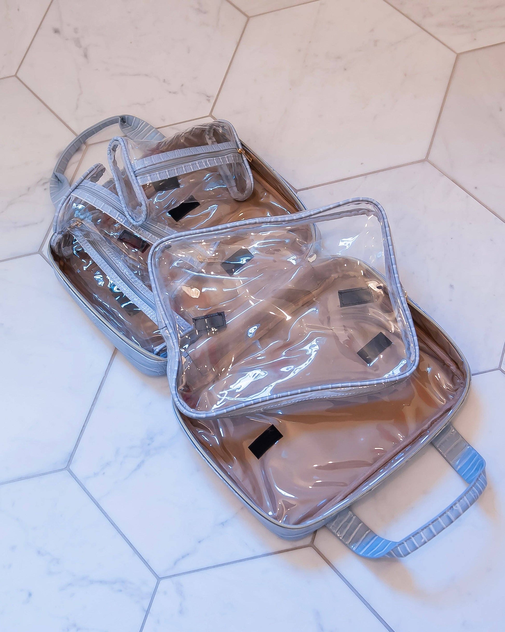 This large case is the ultimate makeup and travel piece. It features a vegan leather embossed croc fabric and two top carrying handles. The three sided zipper allows the case to unfold and lay completely flat, and the interior is lined with a hot pink fabric with a clear protective material. For ultimate organization, this case has four clear removable pouches that are attached to the interior with velcro. Each removable case has a zipper closure. The possibilities are endless when it comes to what this case can carry- cosmetics, toiletries, chargers, and more.