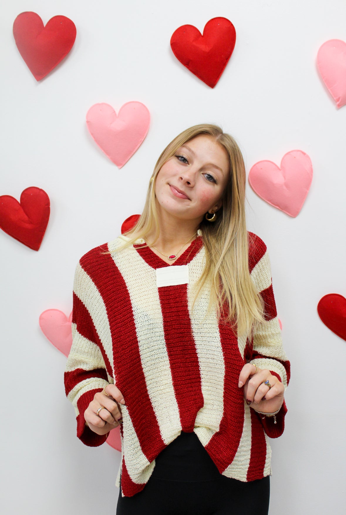 Red Stripe Colorblock V Neck Bracelet Sleeve Sweater: Red Stripe