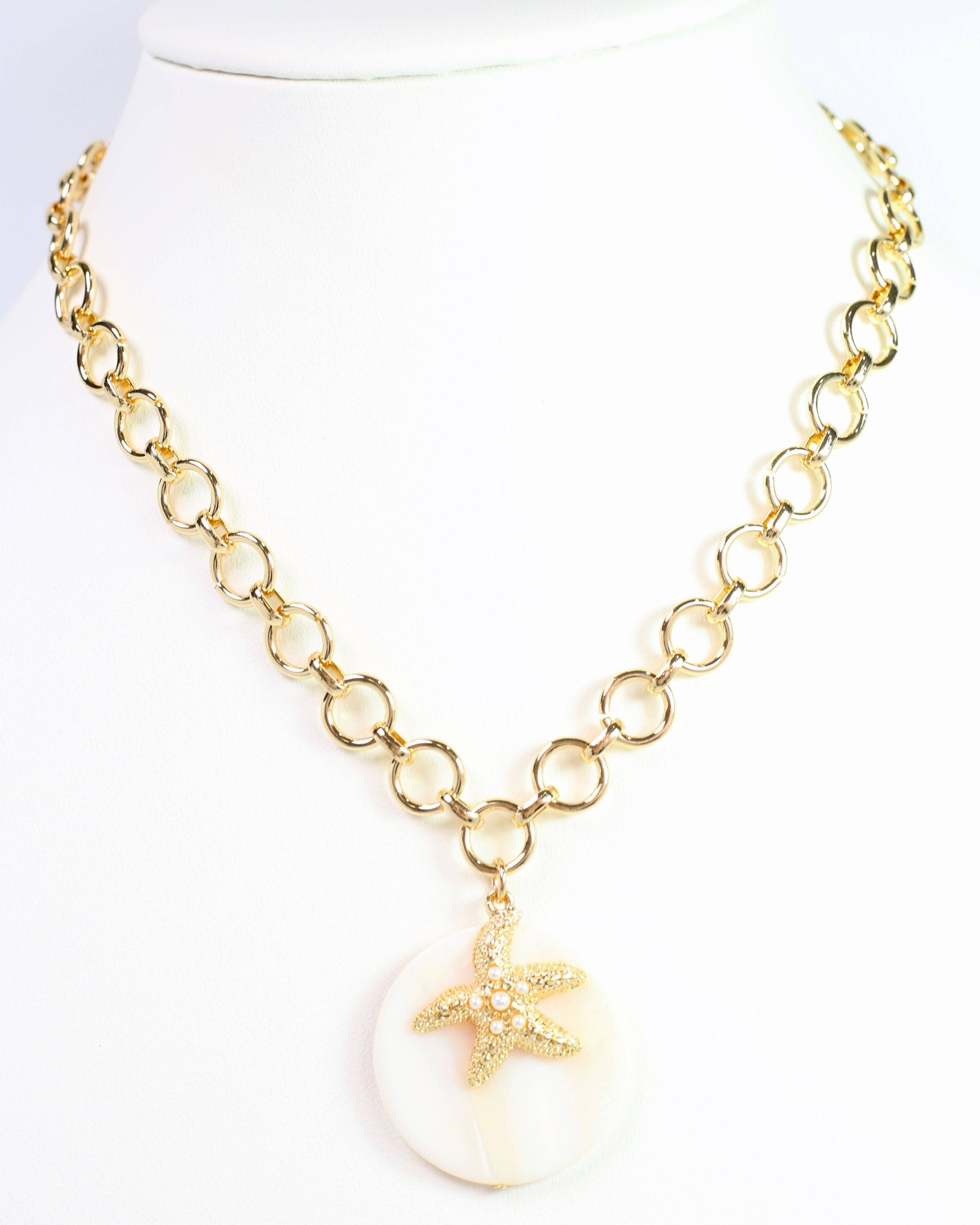 Make a splash with our Sandra necklace! This gold-tone delight features a mother of pearl disc and starfish charm with pearl accents on a circular chain. Beach vibes in jewelry form!