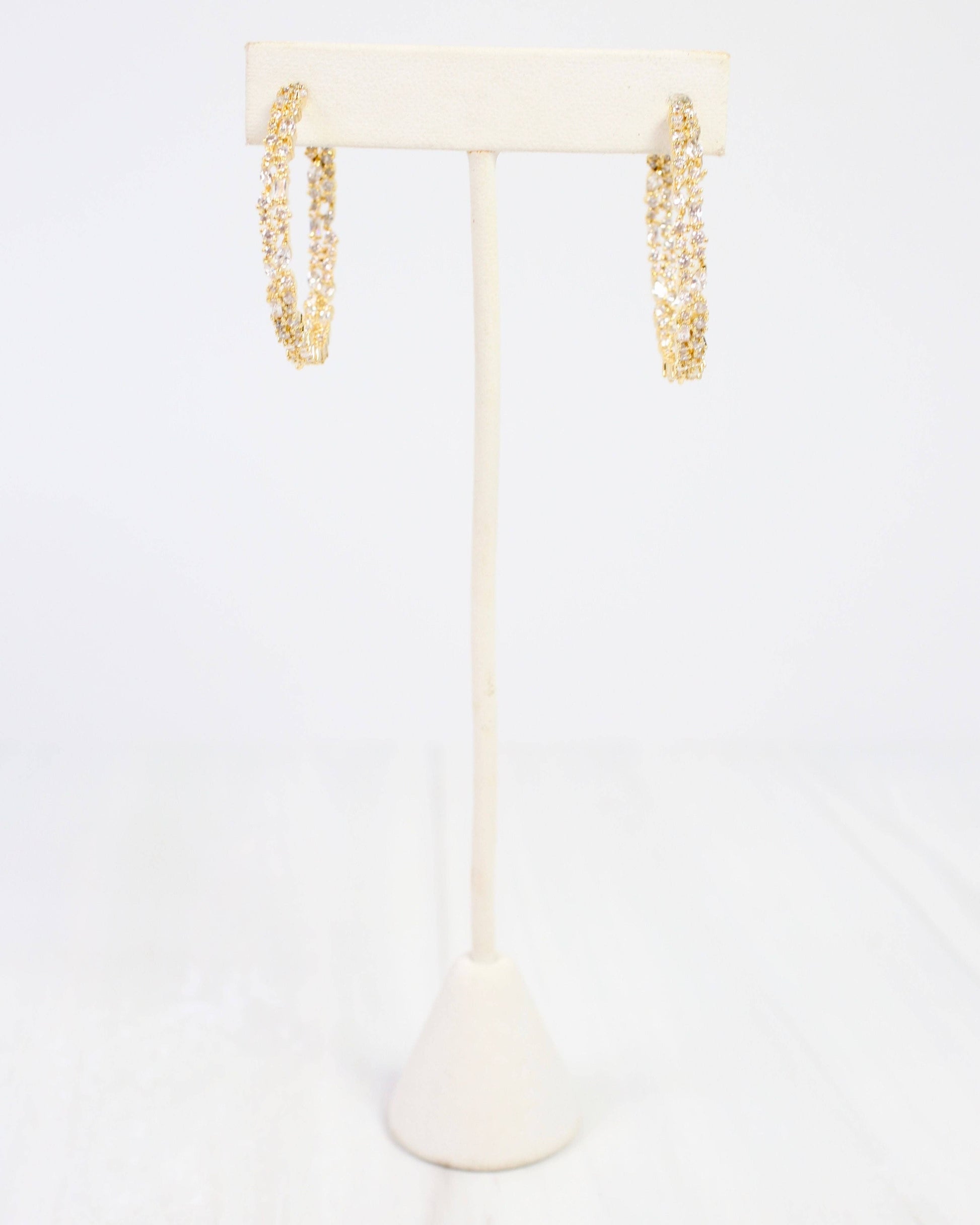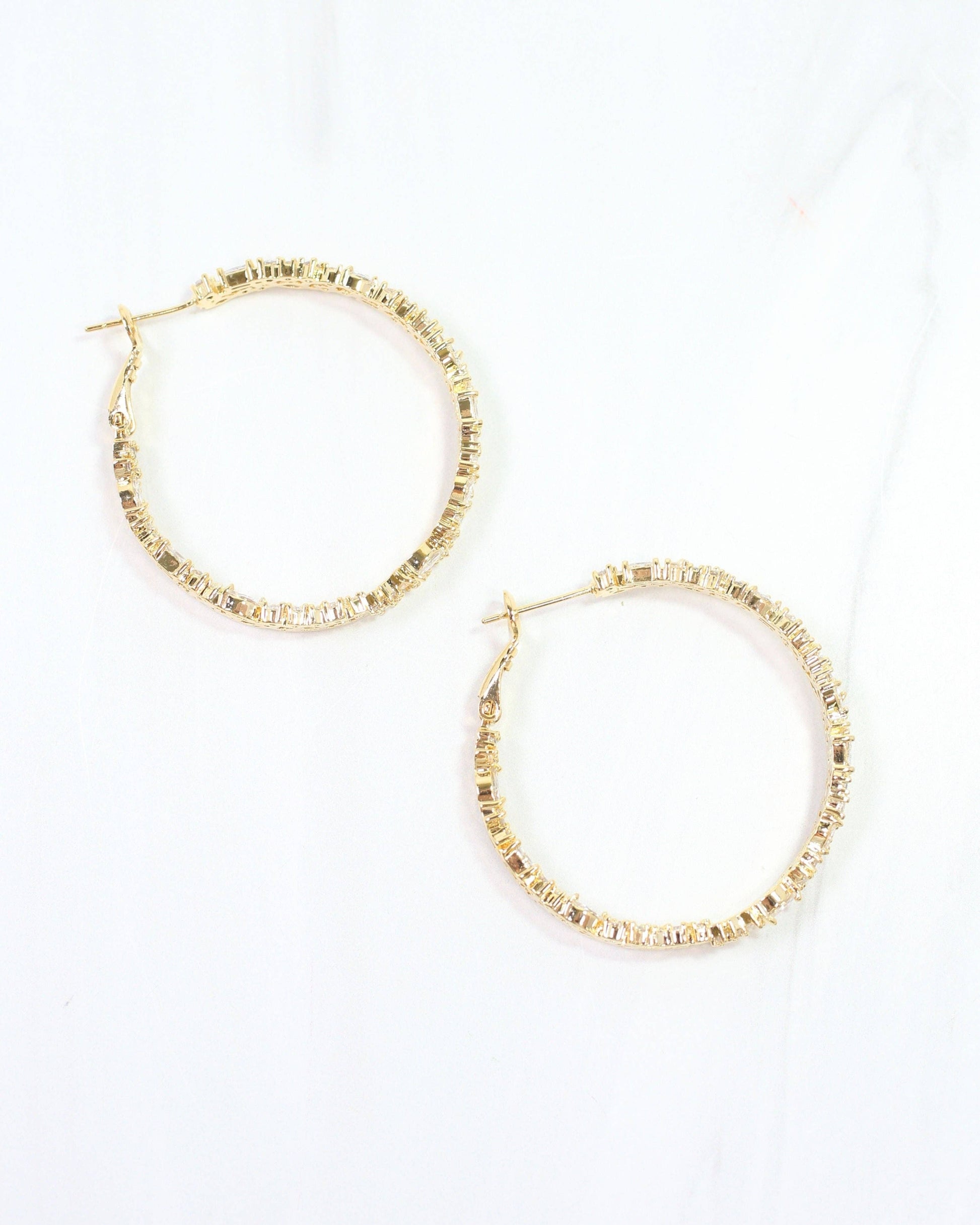The Shelby CZ Embellished Hoop Earring in Gold features a textured, gold-dipped brass design adorned with sparkling cubic zirconia. Its secure latch back ensures easy, comfortable wear, making this hoop a stylish addition to any jewelry collection.