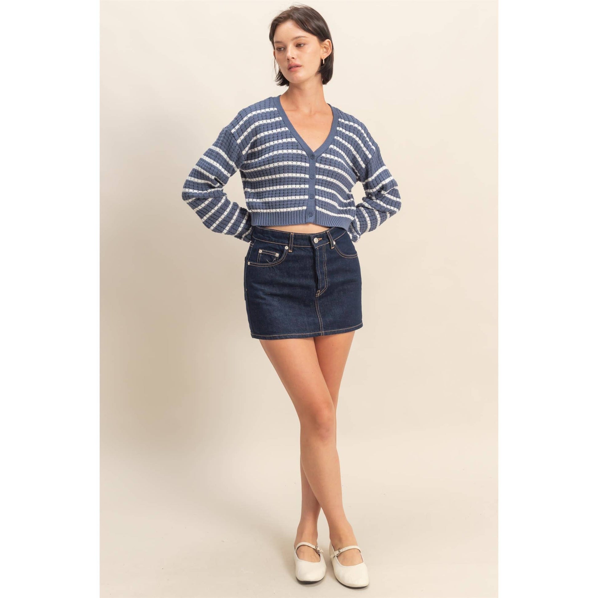 Striped Long Sleeve Buttoned Sweater Cardigan: DUSTY NAVY/WHITE