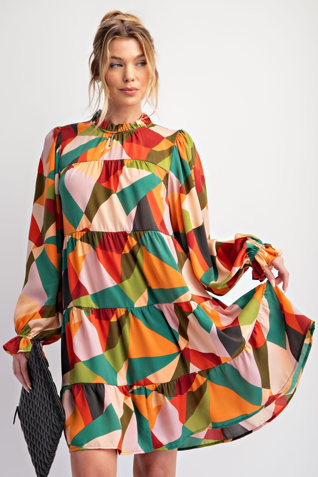 "Make a bold statement with this vibrant geometric print dress! Featuring tiered layers and billowy long sleeves, it's the perfect blend of playful and chic. Pair with your favorite clutch for an effortlessly stylish look."